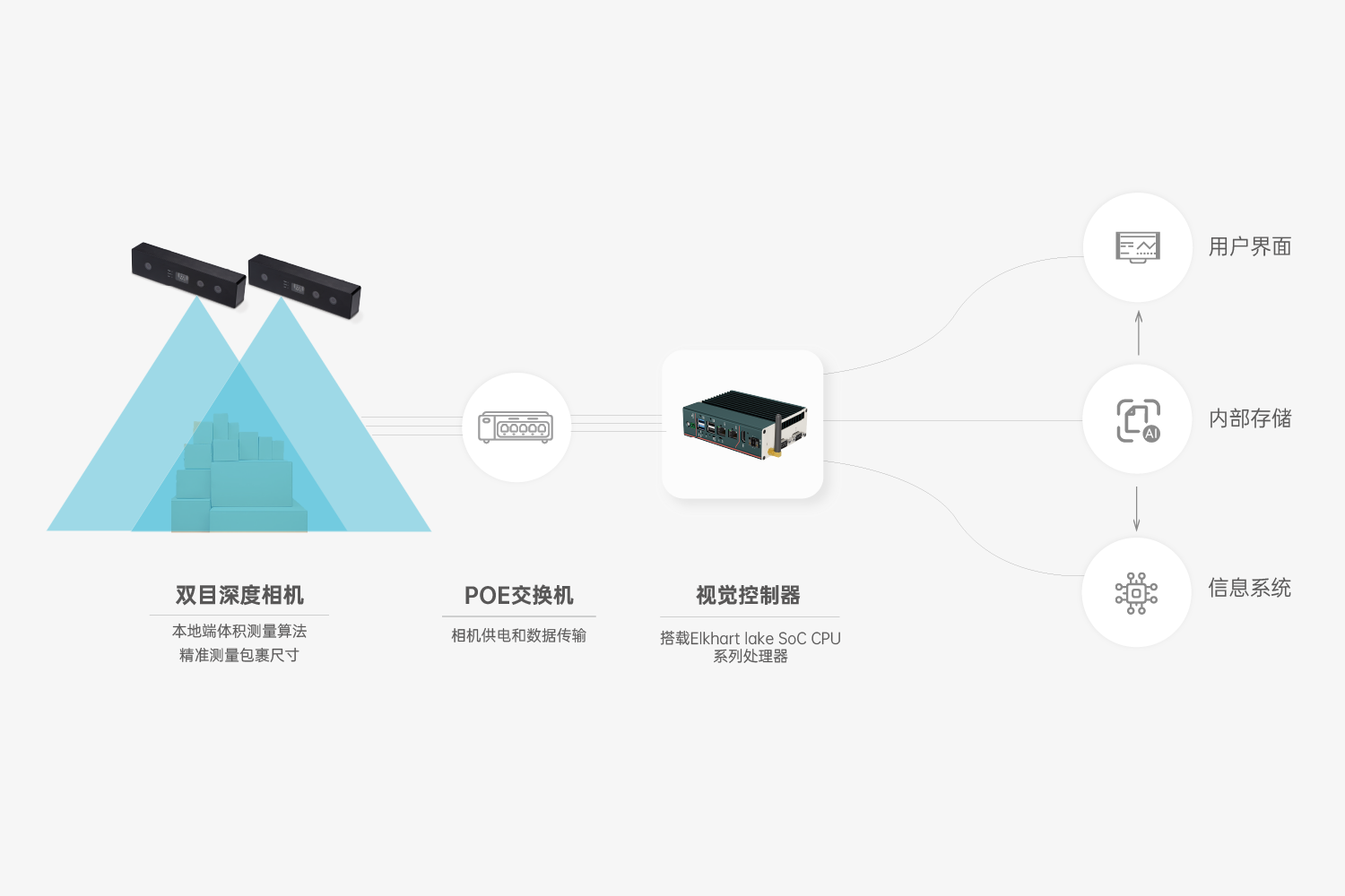 首页 动态 乐鱼官网智能推出全新体积测量解决方案,赋能物流企业数字化降本增效 乐鱼官网智能推出全新体积测量解决方案,赋能物流企业数字化降本增效 企业动态 2024-01-25 浏览量:2208 随着物流行业对精细化管理运营要求不断提升,包裹体积数据对企业提升测量效率和运输效率、优化存储空间及物流配送路线等方面均有重要意义。 物流行业传统采用人工测量方式,测量准确度受限于测量员的技术和经验,不确定性高,效率低,人力成本高,还存在隐形的员工管理成本,以及由于测量误差导致的仓储空间利用率低等问题。 如何进行精细化、自动化、智能化的体积数据采集,从而实现降本增效? 除纸箱等常见货物,对非规则、软包、高反光件、薄件等特殊形态包裹的精准测量,对多数体积测量制造企业提出更高的技术要求。 乐鱼官网智能静态体积测量方案,基于6年技术沉淀,自主研发出HumanoidVisionTM技术,能够精准测量各种类型包裹体积,满足小件、大件、超大货物场景的体积测量需求,用智能赋能物流行业数字化升级。 多相机组合方案 乐鱼官网智能采用主动双目立体成像技术,结合彩色摄像头输出高帧率RGB-D图像,通过自研的高精度体积测量算法,可以精准输出体积数据,满足仓储物流、商超、航空货站等场景下体积测量任务。 方案优势 01 测量精度高,传输稳定高效 稳定输出毫米级精准深度图,扫描帧率达8FPS; 司眸体积测量相机搭载了高精度算法和出色的硬件配置,适用全类型,多尺寸包裹测量场景; 千兆网络传输接口,抗干扰强,传输远,高频率传输数据时不掉线,不丢帧,数据传输稳定; RGBD实例分割算法,精准输出包裹的体积数据,平均测量精度可达5mm。 02 抗环境光干扰,适应性更强 支持光线变化场景下输出精准数据; 支持多曝光融合; 针对高反、强光、暗光场景优化体积测量深度数据; 03 安装范围广,调试易上手 单设备方案最大可支持1.8m高度安装;多设备方案最大可支持3.5m高度安装; 安装角度不严格限制为垂直(可偏差±5°); 接口简单,SDK集成简单,可供多平台SDK,方便二次开发。 应用场景 01 全类型包裹 适用于纸箱、异形件、软包、黑色包裹、高反光件(金属件、型材)、薄件(最低支持1mm薄件)等不同类型包裹的体积测量,一台设备兼具全类型包裹的体积信息采集,为业主提供更全能的解决方案。 02 多尺寸测量 #小件体积测量方案 乐鱼官网体积测量单相机方案最小可测量50mm x 50mm x 1mm立方体,规则物体精度±5mm;不规则物体测量精度:±10mm,适用于小件包裹体积测量场景。 #单设备大件体积测量方案 乐鱼官网体积测量相机内置高精度深度融合算法,具备大视场角,最大可测量1200mm x 1000mm x 1800mm 立方体,规则物体测量精度:±10mm;不规则物体测量精度:±20mm。针对快运行业的大件包裹,可快速精准完成快件的体积信息实时采集。 #方案可定制 乐鱼官网智能还可针对特定货物测量场景定制方案,支持多台3D相机拼接,软件集成拼接算法,最大可测量1800mm x 1800mm x 1800mm 立方体;测量精度:±20mm,针对仓储物流,码垛类型的超大件物体进行体积测量。 上一个:乐鱼官网智能助力连锁门店占领“客户心智” 返回列表 下一个:3D机器视觉可以完成许多2D机器视觉无法完成的任务。 更多新闻推荐 端到端 更易用丨乐鱼官网®散料运输动态监测与预警系统全新上市 新品上市 2025-02-20 小尺寸 更灵活丨乐鱼官网3D相机PEA020-800-Y80S上新,助力多场景智造升级 新品上市 2024-09-29 目前主流3D视觉技术各有什么优劣势?如何选择最Match的工业3D相机? 技术科普 2024-08-12 【最全选型攻略】挑选合适的工业相机,必须提前考虑12要素! 工业相机 2024-07-16 场景应用丨乐鱼官网智能智能煤流监测系统全新升级,赋能自动化煤流管控 场景应用 2024-07-08 场景应用丨乐鱼官网智能3D视觉+AI深度学习,助超大型货物体积测量更准,更稳,更易用 场景应用 2024-06-04