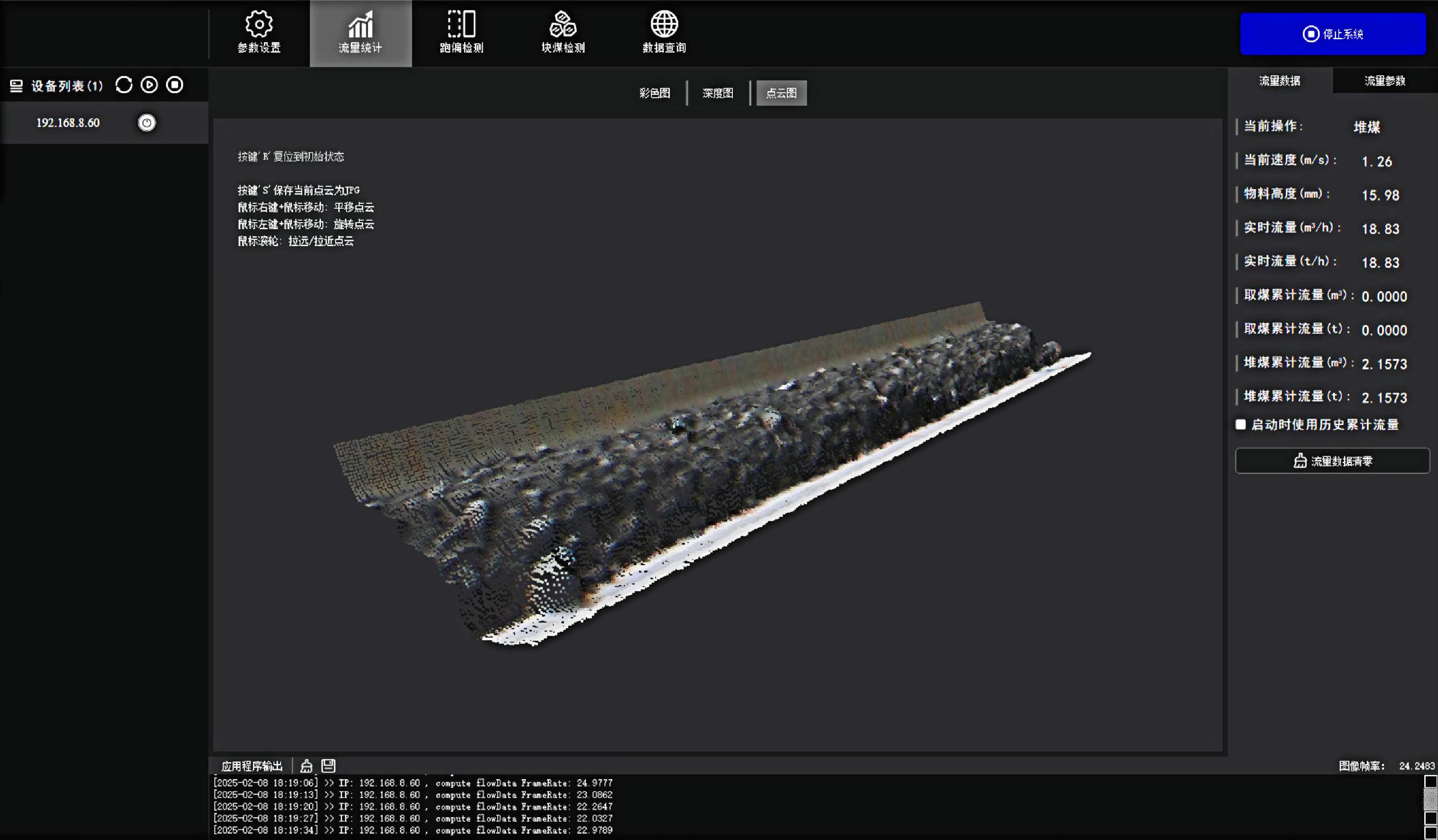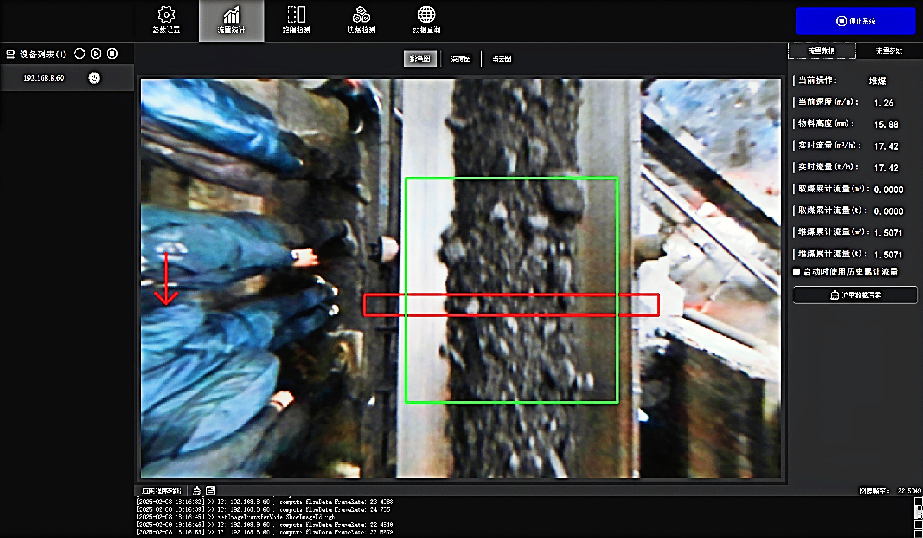 料型料流监测一体机系统 乐鱼官网®智能料型料流监测系统由智能煤流监测一体机搭配监测平台构成,实时监测输送带工业散料流量,包含煤矿、砂石骨料、粮食等 首页 产品 3D相机 乐鱼官网® 料型料流监测一体机 RBGD智能一体机 乐鱼官网® 料型料流监测一体机 系统由智能料流监测一体机搭载监测平台构成,由稳定的底层硬件、嵌入式算法软件和自动化监测管理平台实现服务,实时采集高精度煤流RGBD数据,完成场景的实时三维彩色点云重建,对高速运动的皮带输送机进行精细化管理调控→应用场景: 煤矿检测系统精细化管理 定制解决方案 应用场景 煤流统计支持皮带速度6m/s,环境适应强,部署简单,无需改造现场环境即可安装块煤检测通过三维点云数据分析,能够对块煤的尺寸进行精确测量,准确计算出块煤的长、宽、高等尺寸数据输送带自动测速自动测量高速运动中的输送带速度,确保及时发现异常波动输送带跑偏检测通过获取的输送带三维尺寸位移信息,对皮带左右边缘位置与阈值比较并判断是否偏离正常轨道,同时计算跑偏幅度和方向煤流高度检测对煤流高度精准检测,能够有效管理煤流的分布、运输量、堆积情况 产品特点 测量误差<5%在高速动态检测上,测量精度可达毫米级,测量结果与实际煤量误差小于5%工业级硬件设计采用IP65防护等级和工业级防尘防水,可在高粉尘、大温差的情况下稳定运行室内暗光环境适用在室内、地下、夜晚能稳定测量,无需补光部署简单,安装便捷,支持二次开发出厂相机内参标定,可快速部署集成,无需改变现场环境即可安装,实施速度快,调试简单,系统易于维护接口丰富,数据直传丰富的系统对接接口,可直接对接PLC、变频器、服务器,快速完成精细化皮带控制大景深、大视野,多范围应用测量皮带宽度达2.4m;煤堆高度达1.5m边缘计算架构,实时测量使用边缘计算架构,将多种智能算法在边缘端实现,保证数据实时传输 性能参数 RGBD智能一体机型号VEA020-800-X180参数技术原理主动式双目基线长度180mm测量范围0.9m~2.5mZ向精度1m:≤1.3mm帧率25fps数据类型深度图、彩色图、红外图、点云图分辨率彩色图像:1280x800/640x400 ; 深度图像:1280x800/640x400像素形式彩色图: 8位三通道图 ;深度图:16位单通道图彩色视场角Horizontal 90°,Vertical 64°深色视场角Horizontal 90°,Vertical 64°RGBD同步对齐支持曝光类型全局曝光曝光控制自动/手动流量统计技术参数推荐安装高度1.2m~1.5m覆盖输送带范围0~3m支持输送带速度0~6m/s,推荐0~4m/s流量统计精度误差<5%物料高度测量支持,精度毫米级自动测速支持,安装位置需要具备照明条件实时流量统计 支持,统计周期支持配置跑偏检测支持,跑偏精度可达毫米级块煤检测 支持,支持块煤参数定义数据存储支持5年以上体积结果化数据存储数据查询支持按小时,天和月等维度查询实时视频支持rtsp协议彩色图像拉流点云数据支持彩色点云拼接数据输出协议支持TCP硬件参数数据传输接口千兆以太网相机供电要求12V~24V DC功耗18w结构尺寸(mm)270mm x 80mm x 44mm重量(g)1200g防护等级IP65温度工作温度:-25 ~50°C ;存储温度:-30 ~80°C湿度20% ~ 85%散热方式被动散热软件支持开发环境Windows/Linux数据协议TCP数据查看流量统计客户端 点云图 资料下载 乐鱼官网® 煤流体积测量输送带监测管理平台 产品资料下载 请填写此表格并点击提交后,程序会自动下载文件 *合作意向 请选择 商务合作 媒体合作 投资者合作 *电话 *姓名 公司 行业 职位 邮箱 地址 您的留言 提交并下载资料 您也可以拨打我们的客服电话:010-81046658 联系我们